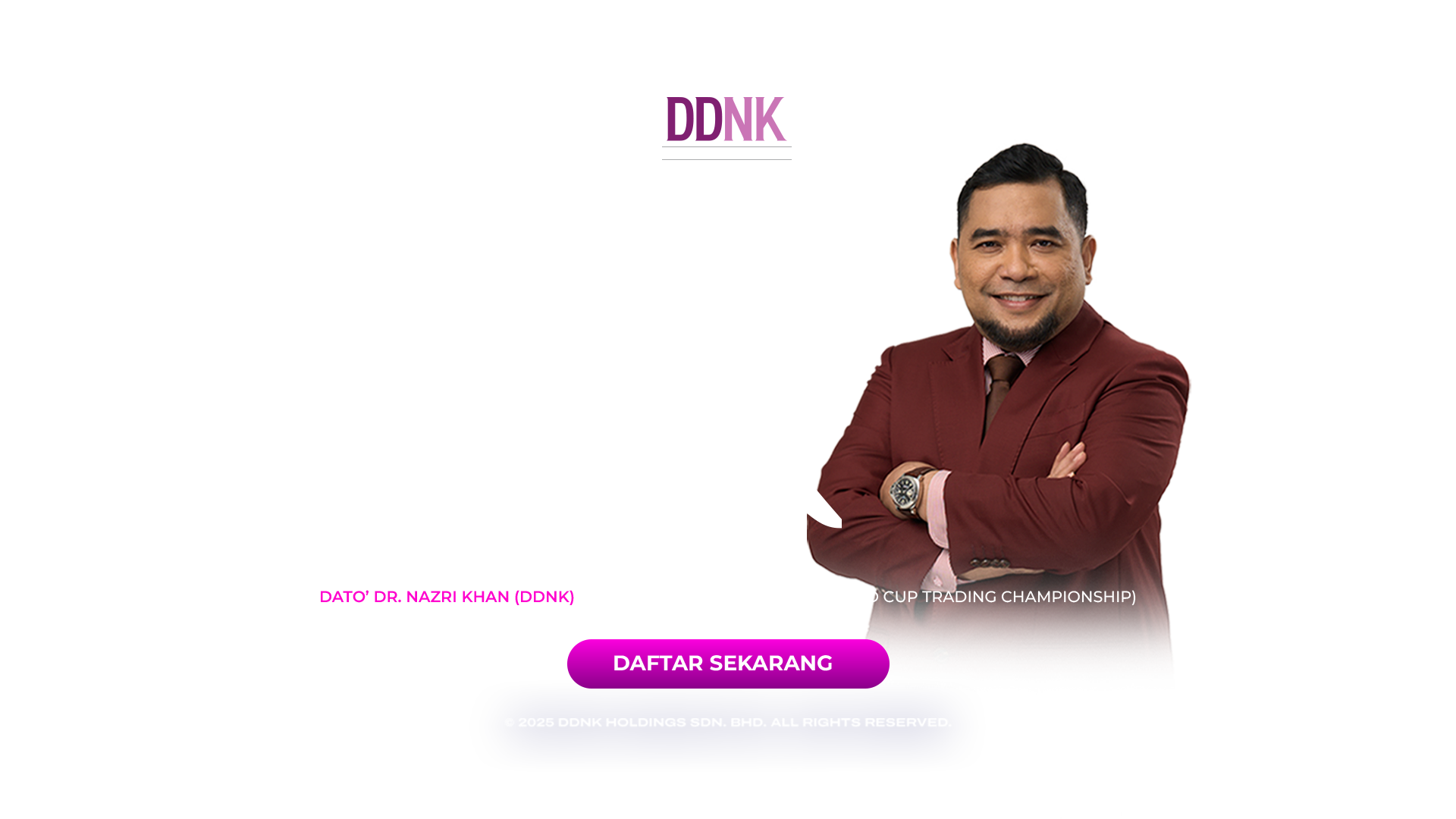 Dato’ Dr. Nazri Khan, atau lebih dikenali sebagai DDNK, adalah seorang Pengurus Dana Bertauliah yang Berlesen. Beliau merupakan Juara Trader Dunia yang diiktiraf di pentas ‘World Cup Trading Championship’ oleh Robbins Cup dengan rekod pulangan sebanyak 302.5% suku pertama, 179.6% suku kedua dan 357.2% suku ketiga dan 223.4% suku keempat. Penerima pengiktirafan Malaysia Book of Records Malaysia Book of Records for ‘Most World Cup Trading Championships Won in the Year 2024.’ Beliau telah menginspirasi ramai individu untuk mencapai tingkatkan kewangan melalui strategi perdagangan dan pelaburan yang telah dibuktikan.
