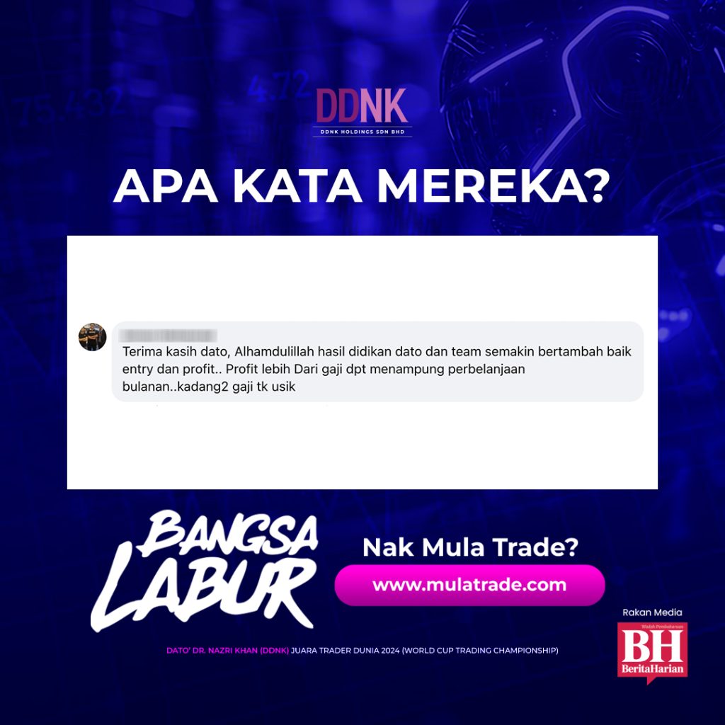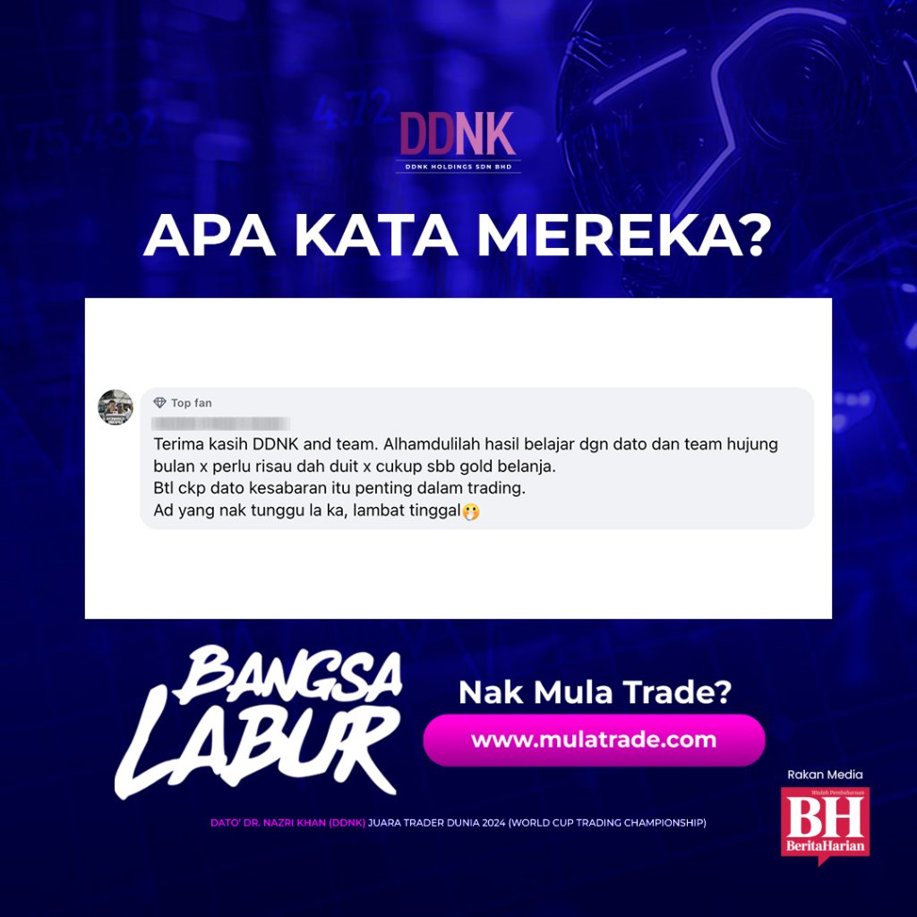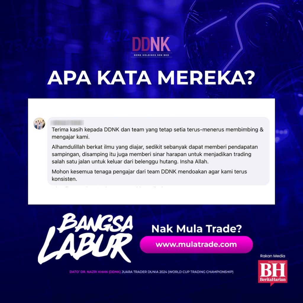 Harap maklum bahawa dunia trading melibatkan risiko yang perlu ditanggung oleh setiap peserta. Kejayaan atau kegagalan dalam trading bergantung kepada pelbagai faktor, termasuk latihan berkala, ilmu yang diperoleh, disiplin, ketekunan, sikap, kerja keras, serta kesabaran individu. Tiada jaminan keuntungan diberikan, dan setiap keputusan yang dibuat adalah tanggungjawab peserta sepenuhnya.